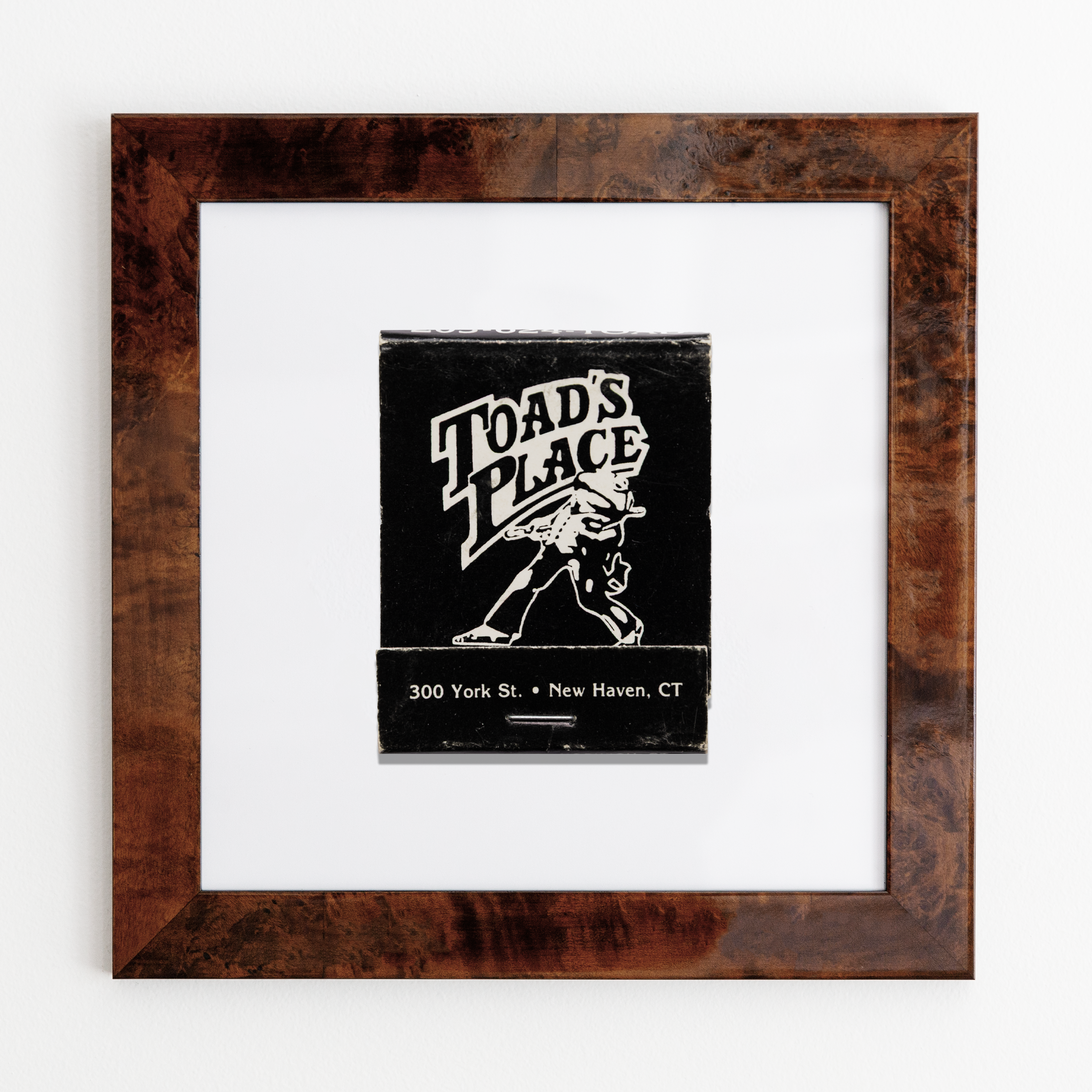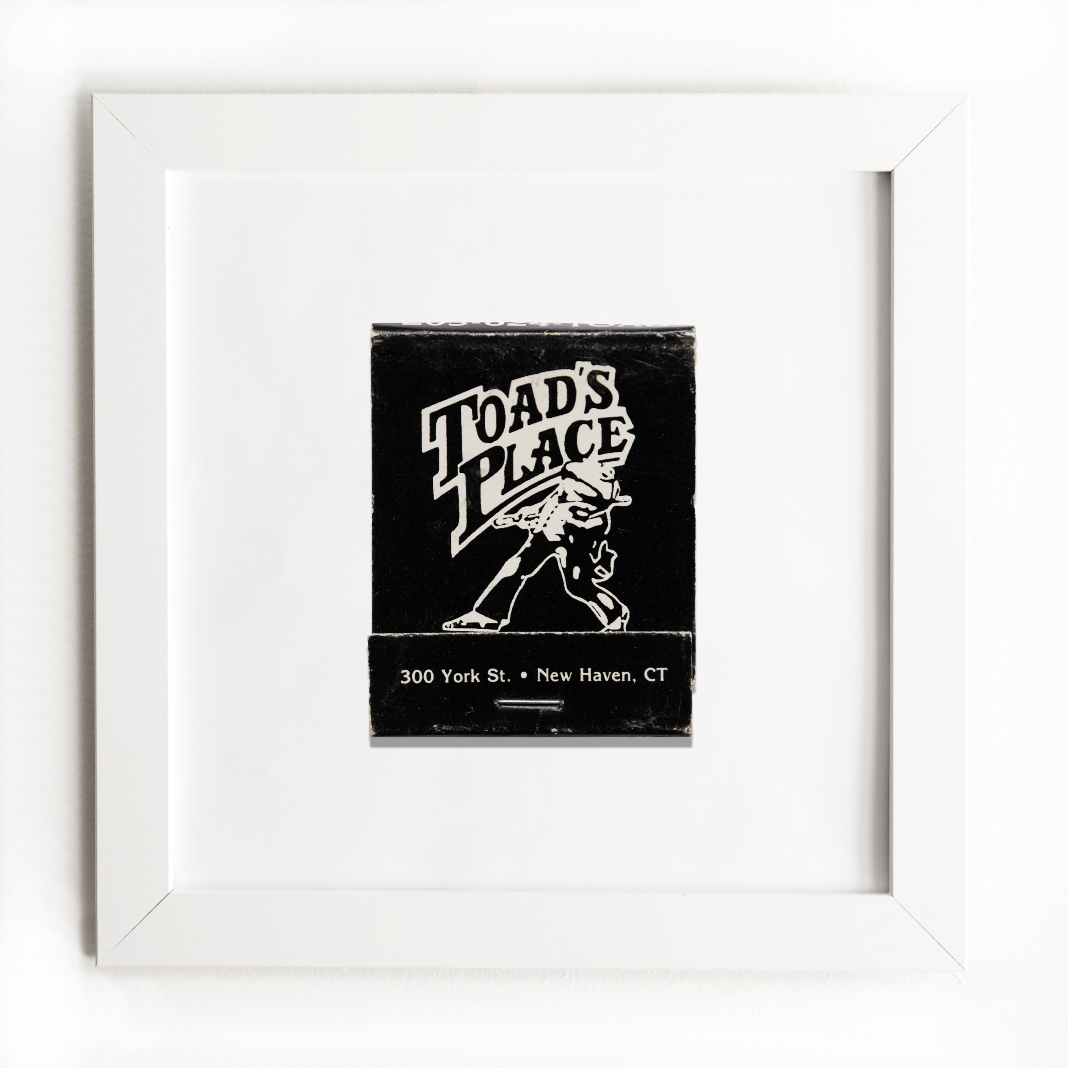 Toads Place (front) framed print captures the essence of vintage matchbook art in a 12x12 inch print, framed in a minimalist 14x14 white flat profile. With a clear acrylic cover ensuring safe delivery, this print is the perfect gift for anyone looking to add a piece of history to their walls.