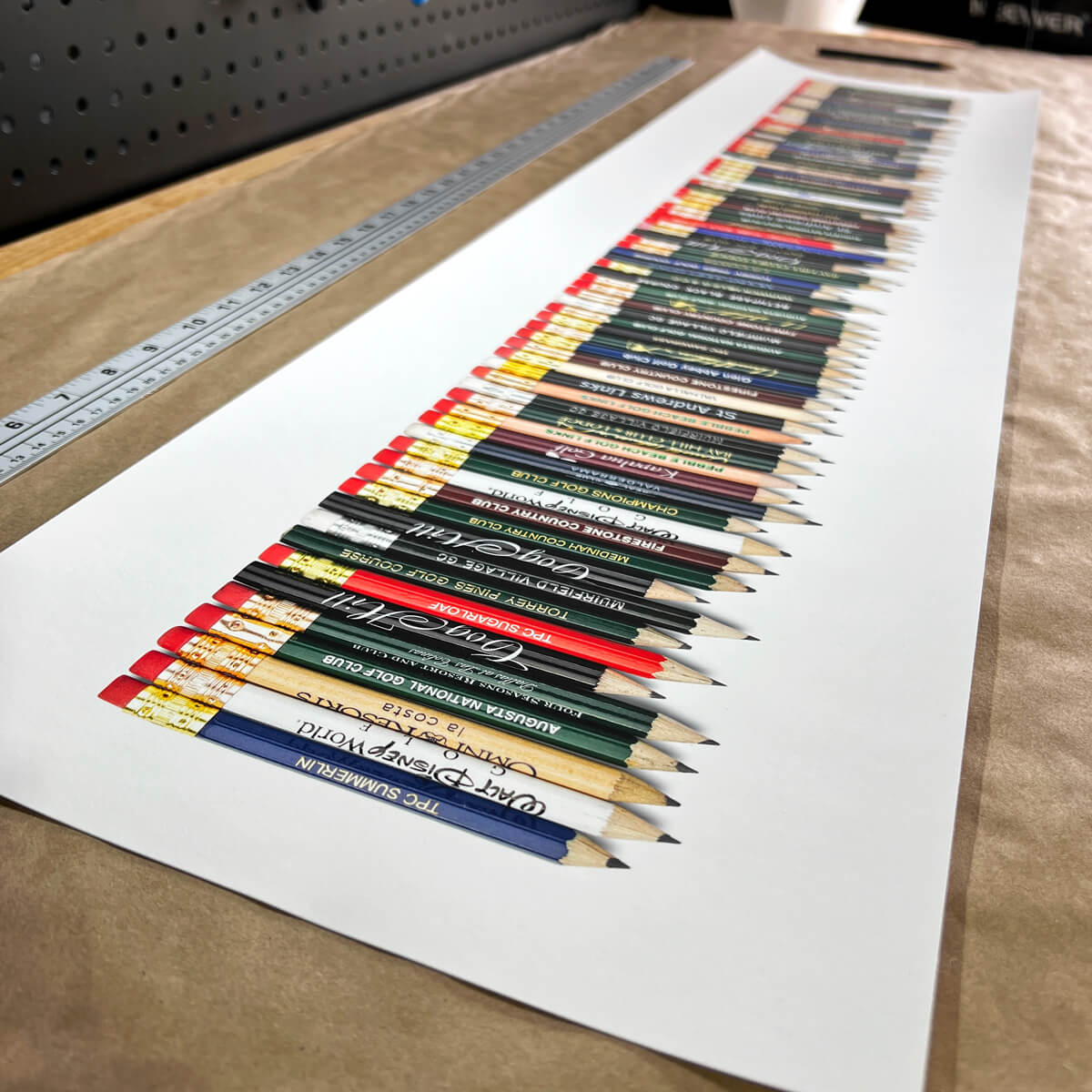 An incredibly cool, inspirational and unique fine art print that honors one of the best golfers of all time. Winning Wood 82 is a compilation of pencils from all the golf courses (in order) where Woods was victorious.